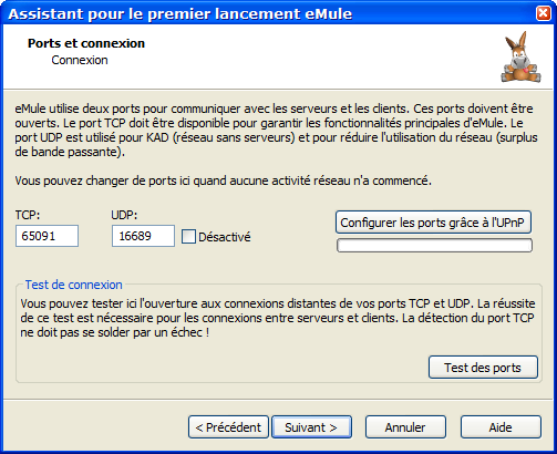 Depuis la version 0.48a, eMule supporte l'UPnP (Universal Plug and Play) qui permet de configurer plus facilement les routeurs et pare-feux. Votre routeur doit être compatible avec l'UPnP. Si eMule est capable de paramétrer le mappage des ports via l'UPnP dans votre routeur, vous n'avez plus besoin de vous soucier de l'ouverture des ports : eMule la fera automatiquement. Pour tester si l'UPnP est disponible sur votre système, utilisez l'Assistant au premier démarrage (accessible via le menu "Outils" => "Assistant pour le premier lancement eMule") et cliquez sur le bouton "Configurer les ports grâce à l'UPnP".