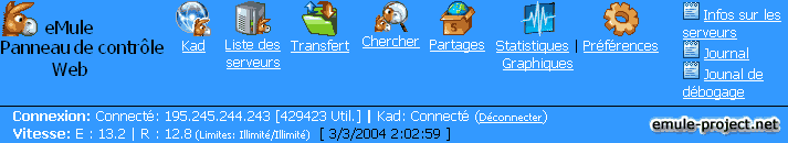 L'accès à presque toutes les fonctions d'eMule est possible dans l'Interface Web. Tous les changements affectent directement eMule sur le PC serveur.