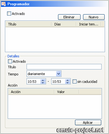 El programador se usa para variar ligeramente la configuración de eMule y aplicar los cambios a una hora y día de la semana concretos. Puede ser usado para activar eMule y descargar durante el horario nocturno aprovechando los restos de ancho de banda dejados por otras aplicaciones respecto al horario de trabajo.
