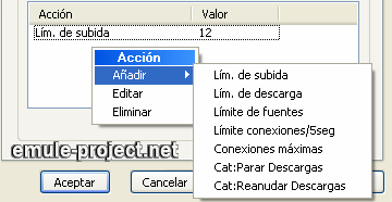 Si ninguna acción es válida a su hora de inicio, eMule automáticamente usa los valores por defecto o los marcados en Preferencias.