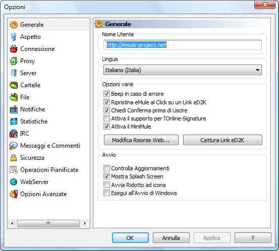 Se questa opzione è selezionata, eMule cercherà un nuova versione ad ogni avvio. E' possibile impostare ogni quanti giorni verrà effettuata la verifica degli aggiornamenti attraverso una barra scorrevole.