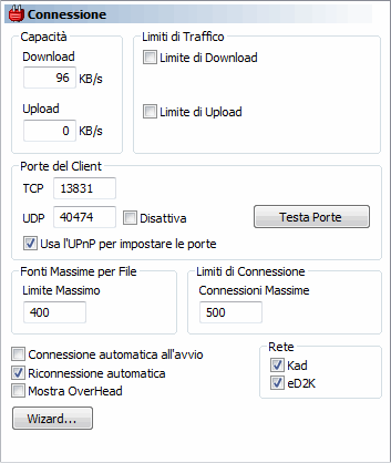 Per configurare le opzioni di connessione bisogna trovare la reale velocità che la tua connessione offre. Puoi trovarla nel tuo contratto con l'ISP o sul suo sito web. Il pulsante "Wizard..." offre anche alcuni valori preconfigurati per i più comuni tipi di connessione. Se non trovi queste informazioni, puoi anche lasciare vuoto impostando la capacità upload a 0. eMule cercherà di capire la quantità di dati che la tua linea è in grado di gestire senza "ingorghi" (questa funzione è chiamata USS, vedi sotto).