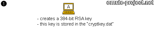 Il client A vuole assicurarsi che i suoi crediti sono al sicuro e vengono usati solamente da lui. Crea quindi una chiave privata RSA a 384 bit e la memorizza nel file cryptkey.dat. Questa chiave privata viene creata al momento di usare la codifica per la prima volta. Se questa chiave viene persa, il client A avrebbe perso tutti i suoi crediti, in quanto non è più in grado di dimostrare che ne è il legittimo proprietario.