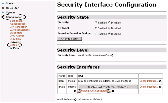2. Dort unter Configuration » "Security" bei den Security Interfaces