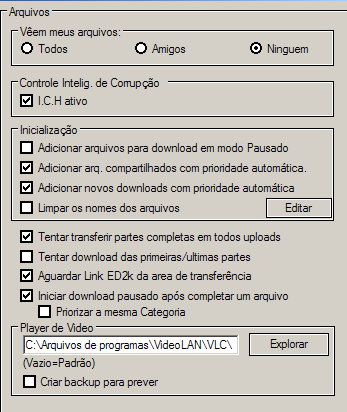 Se esta caixa estiver vazia, o eMule usará o player de mídia padrão associado com este tipo de arquivo quando pré-visualizar arquivos de vídeo. Se um caminho para outro player for especificado aqui, este será utilizado ao invés do player padrão. Usualmente a maioria dos players de mídia necessitam de um arquivo temporário pois eles não tratam os intervalos em arquivos incompletos muito bem. Se o player padrão for utilizado a caixa Criar backup para prever deve ser marcada. Um player de vídeo que não necessita deste arquivo temporário é o VLC - Cliente do VideoLAN que pode ser usado para pré-visualizar arquivos do eMule ao invés do player padrão. Para mais informações veja também Pré-visualizar Arquivos.